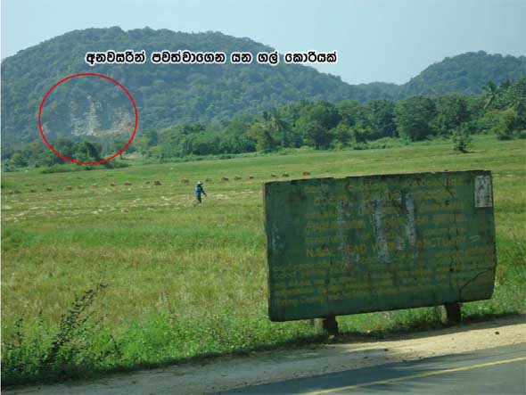 2009 අංක 22 දරන පනතින් අවසන් වරට සංශෝධිත වන සත්ත්ව හා වෘක්ෂලතා ආරක්ෂක ආඥා පනතේ 7 වන වගන්තියට අනුව අභය භූමියක් තුළ වනාන්තර එළි පෙහෙළි කිරීම, කැණීම් කටයුතු සිදු කිරීම හා පාරවල් තැනීම නීති විරෝධී වේ. මේ සියලූම නීති විරෝධී ක්රියා මේ ගල්කොරි පවත්වා ගෙන යෑම සඳහා සිදු කර ඇත. නමුත් ඊට එරෙහිව වනජීවී සංරක්ෂණ දෙපාර්තමේන්තුව මෙතෙක් කිසිදු ක්රියාමාර්ගයක් ගෙන නොමැති වීම කණගාටුවට කරුණකි.