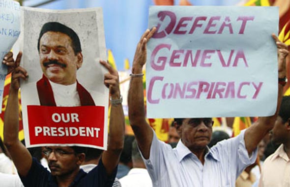 @Image: Supporters of Sri Lankan President Mahinda Rajapaksa protest in Colombo against the U.N. Human Rights Council in Geneva. (Reuters/Dinuka Liyanawatte)