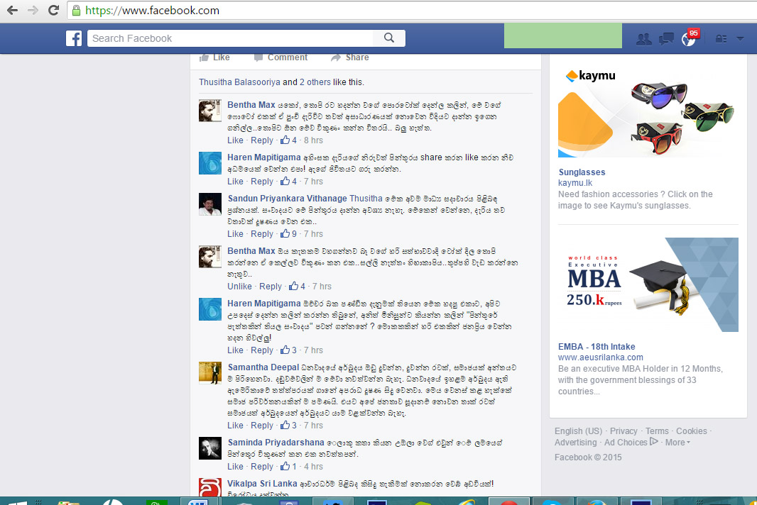 පහත පළවන්නේ ඊයේ(14) දහවල් එම ෆේස්බුක් ප්රතිචාර සටහනේ පිංතූරයකි. මෙය විශේෂයෙන් සටහන් කරන්නේ සමාජ ජාල තුළ කෙතරම් ආචාරධාර්මික දේවල් පළවුවද එයට විරුද්ධව ශිෂ්ඨත්වය වෙනුවෙන් සටන් කරනු ලබන පිරිසක් සිටින බව ද දැක්වීමටය.