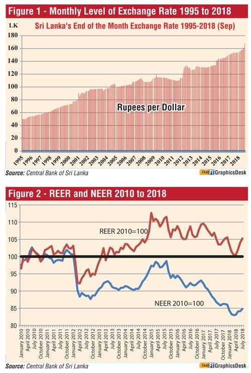 1995 සිට 2018 සැප්තැම්බර් මැද භාගය දක්වා ඩොලරයට සාපේක්ෂව රුපියලේ අගය පහත වැටීමක් පළමු වැනි රූප සටහනින් පෙන්වා දෙයි. අතරින්පතර උස් පහත් වීම ඇතත්, එය එක දිගටම පහළ යාමක් බව පෙනේ. එබැවින් විනිමය වෙළඳපොල තුළ එක දිගටම මේ ආකාරයෙන් රුපියල අවප්රමාණ වීමේ හේතු හඳුනා ගැනීම වැදගත් ය.