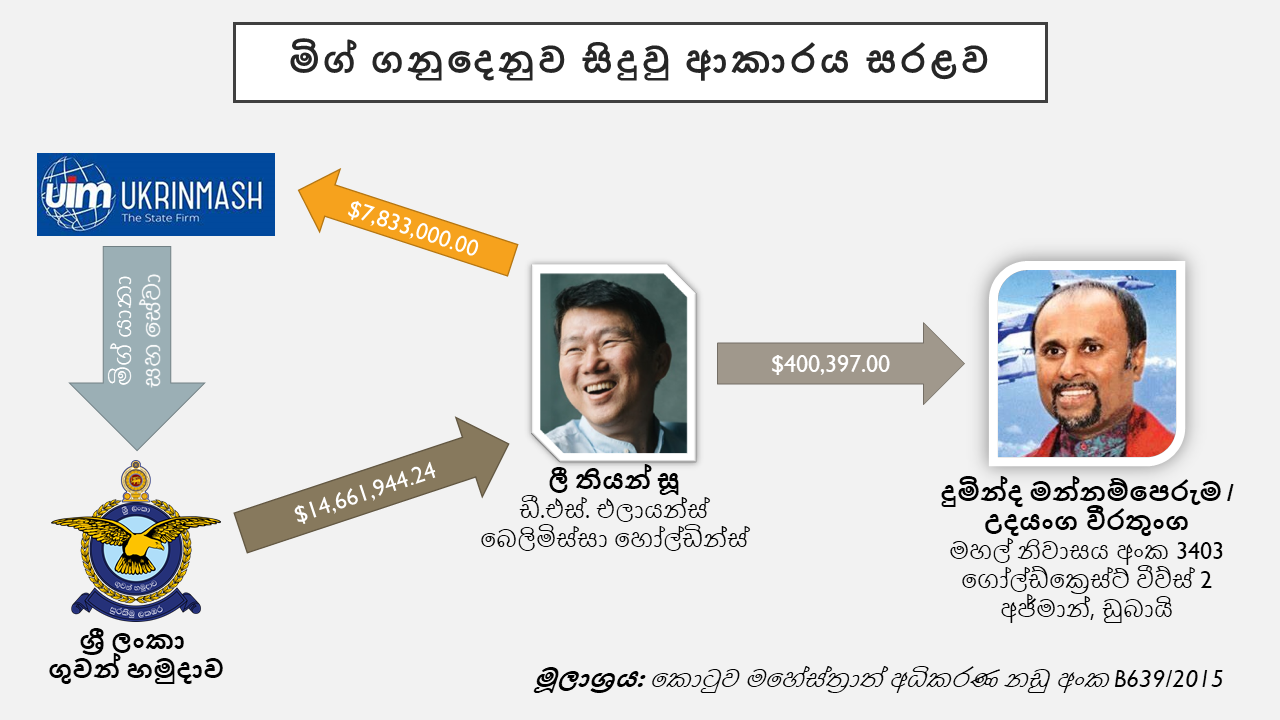 ඉතින් මිග් ගනුදෙනුව එයයි. එල්ටීටීඊය පරාජය කිරීම සඳහා භාවිතා කරන ආයුධ සහ සේවා මිලදී ගැනීම සඳහා ශ්රී ලංකාව සිංගප්පූරු අතරමැදිකරුවන්ට 87% ක කොමිස් මුදලක් ගෙවා ඇත. ඒ මුදලින් අවම වශයෙන් ඩොලර් 400,000ක් ක මුදලක් සිංගප්පූරු අතරමැදිකරුවන් විසින් ගෝඨාභය රාජපක්ෂගේ ඥාති සහෝදරයා වන උදයංග වීරතුංගට ගෙවා ඇති අතර ඒ මුදලින් ඔහු ඩුබායි හි සුඛෝපභෝගී පෙන්ට්හවුස් නිවසක් මිලදී ගත් බව අප දනිමු.