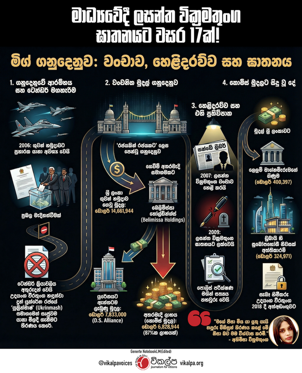 මාධ්යවේදී ලසන්ත වික්රමතුංග ඝාතනය කර වසර 17ක් ගත වුවද, ඔහු තම දිවියෙන් වන්දි ගෙවූ ඒ ‘මිග් ගනුදෙනුවේ’ බිහිසුණු සත්යය තවමත් ශ්රී ලාංකේය දේශපාලන ඉතිහාසය තුළ නොමැකෙන අදුරු කැළලක්ව පවතී. රජයකින් රජයකට සිදු වූ විනිවිදභාවයකින් යුතු ගනුදෙනුවක් ලෙස ව්යාජ ලෙස හඟවමින්, ශ්රී ලංකා රජයේ මුදල්වලින් 87%ක දැවැන්ත කොමිස් මුදලක් (ඩොලර් 6,828,944.24 ක්) බෙලිමිස්සා වැනි ව්යාජ සමාගම් හරහා බලවතුන්ගේ සාක්කුවලට ගිය ආකාරය සන්ඩේ ලීඩර් පුවත්පත හරහා ඔහු නිර්භීතව හෙළිදරව් කළේය. එවකට ආරක්ෂක අමාත්යංශ ලේකම්වරයාගේ ඍජු මැදිහත්වීම මත සිදු වූ මෙම මහා පරිමාණ දූෂණය පිළිබඳව අධිකරණය හමුවේ සාක්ෂි දීමට පෙර ලසන්තව නිහඬ කිරීමට ‘නපුරු මිනිසුන්’ තීරණය කළේ, එමගින් තම බලය සහ වංචාවන් ආරක්ෂා කර ගැනීමට බව ඔහුගේ දියණිය වන අහිම්සා වික්රමතුංග විසින් 2021 ජනවාරියේ දී ලිපියක් ලියමින් පෙන්වා දෙයි.