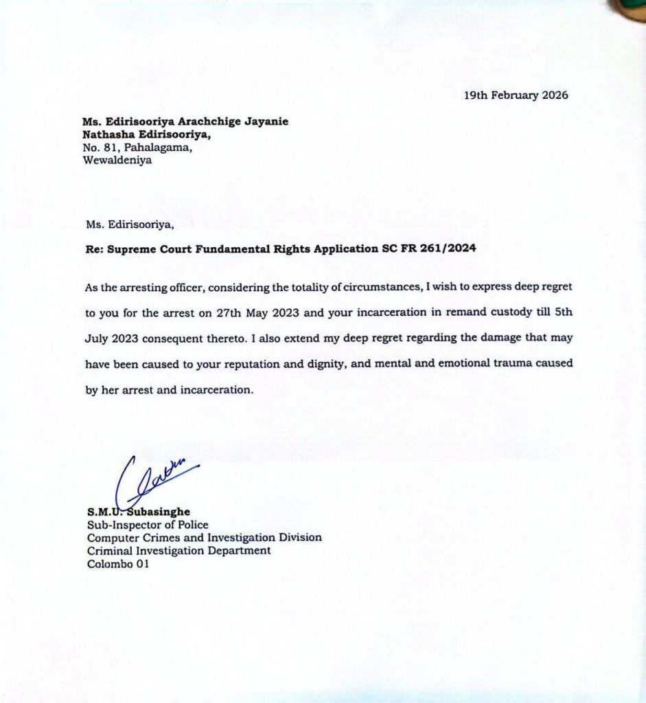 ප්රහසන ශිල්පිනී නතාෂා එදිරිසූරිය අත්අඩංගුවට ගැනීම සම්බන්ධයෙන් අපරාධ පරීක්ෂණ දෙපාර්තමේන්තුවේ (CID) පරිගණක අපරාධ අංශයේ හිටපු ස්ථානාධිපතිවරයා ඉකුත් පෙබරවාරි 19 වන දා ශ්රේෂ්ඨාධිකරණය හමුවේ නිල වශයෙන් සිය “කනගාටුව” පළකර ඇති බව වාර්තා විය. රජයේ නීතිඥවරයා මගින් ඉදිරිපත් කළ මෙම කනගාටුව පළකිරීමේ ලිපිය, එක් අතකින් යුක්තිය පසඳලීමේ ජයග්රහණයක් සේ පෙනුණද, එමගින් වසන් කළ නොහැකි බරපතල අඳුරු පැත්තක් පෙන්නුම් කරයි. එනම්, පොලීසියේ වැරදි තීරණ නිසා නිදහස් පුරවැසියෙකුගේ ජීවිතයට සහ මානව හිමිකම්වලට සිදුවන ආපසු හැරවිය නොහැකි හානියයි.