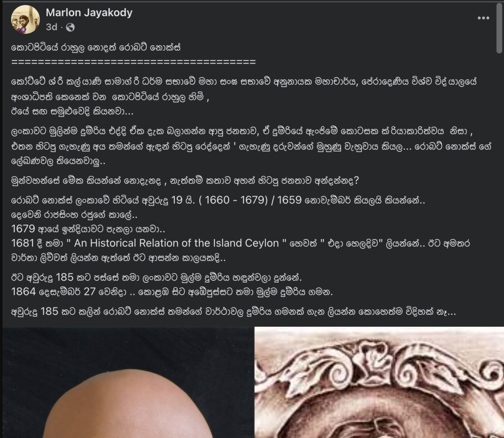 පසු සටහන – මාලන් ජයකොඩි සිය ෆේස්බුක් හි මෙවන් අදහසක් ප්රකාශ කර ඇත. කොටපිටියේ රාහුල නොදත් රොබට් නොක්ස්